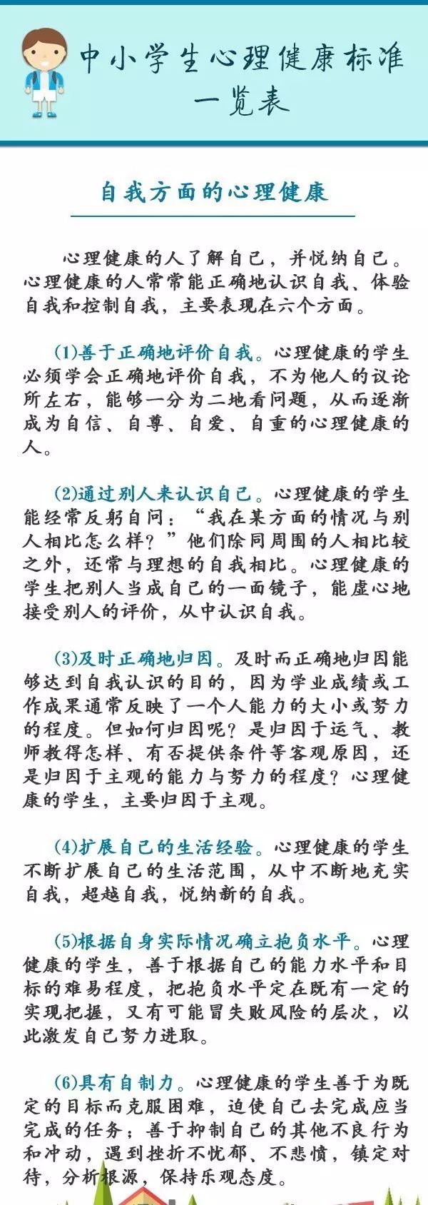 北京师范大学教授林崇德认为,对于中小学心理健康在每个方面的具体标准,大体可概括成三方面:一是敬业,二是乐群,三是自我修养。对照标准看,培养阳光好孩子!